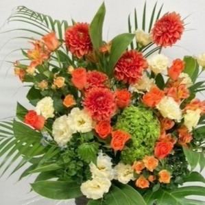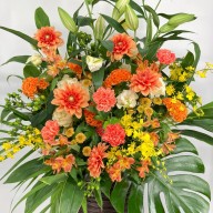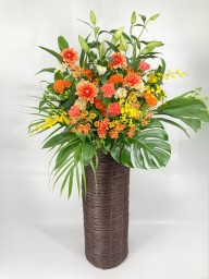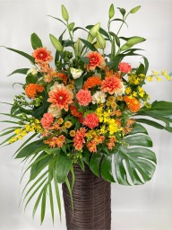 鮮やかなオレンジと黄色がよく映える華やかなアレンジメントです。サイズ:H160㎝×W80㎝