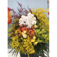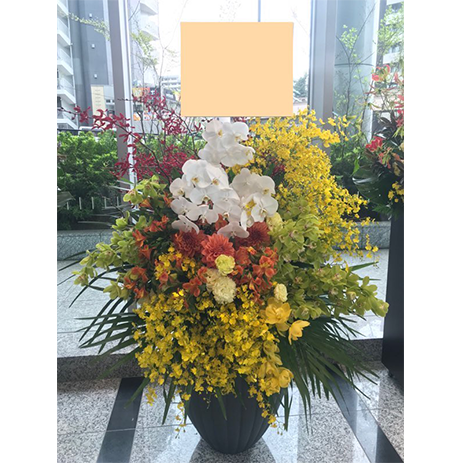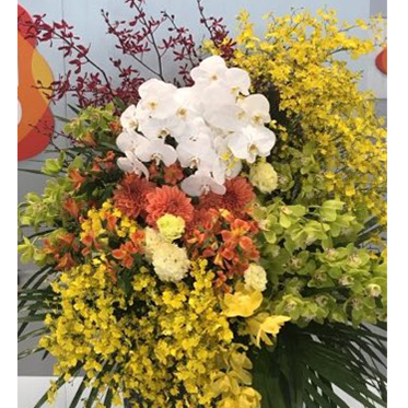 胡蝶蘭、オンシジュームを使った豪華な特注アレンジメントです。胡蝶蘭には「幸福が飛んでくる」という花言葉があり、幸せな未来への願いを込めたお祝いにぴったりです。お取引様の大切なお祝いをボリューム満点アレンジメントでお祝いしませんか?