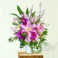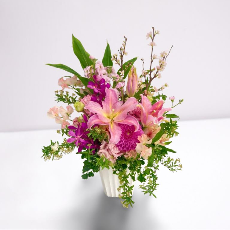 一番人気のピンク系のアレンジメントは、新たな門出にふさわしく、桜の枝をあしらい、お祝いのシーンを華やかに盛り上げます。会議室での入社式や受付のカウンターなど、場所を選ばず飾っていただけます。