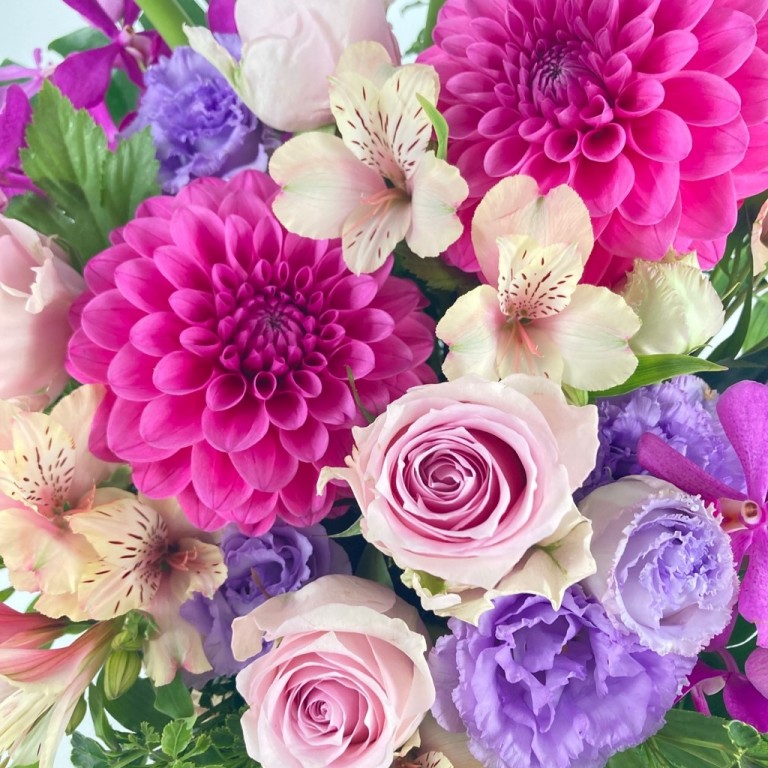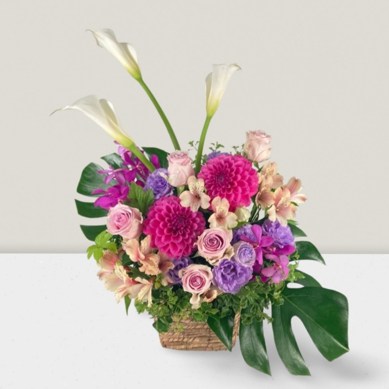 ピンクの綺麗なダリア、バラ、トルコキキョウ、モカラ、アルストロメリアのピンクのグラデーションで大人可愛くまとめました。ラインにカラーとモンステラを使い、お洒落に仕上げています。