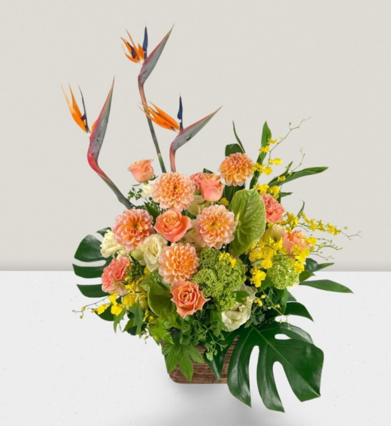ストレリチアを伸びやかに使用し、オレンジ系でまとめた明るく豪華なアレンジメントです。