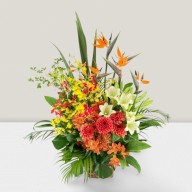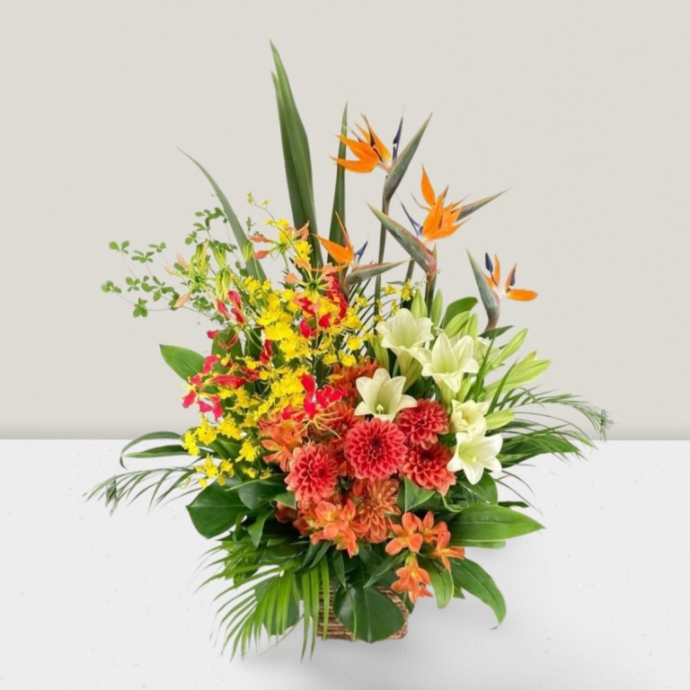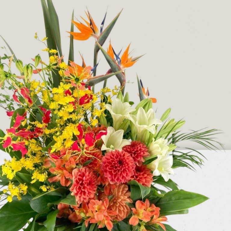 オレンジをメインに華やかな花をボリュームよくまとめました。
