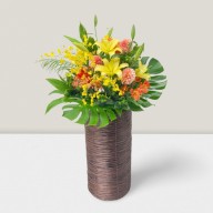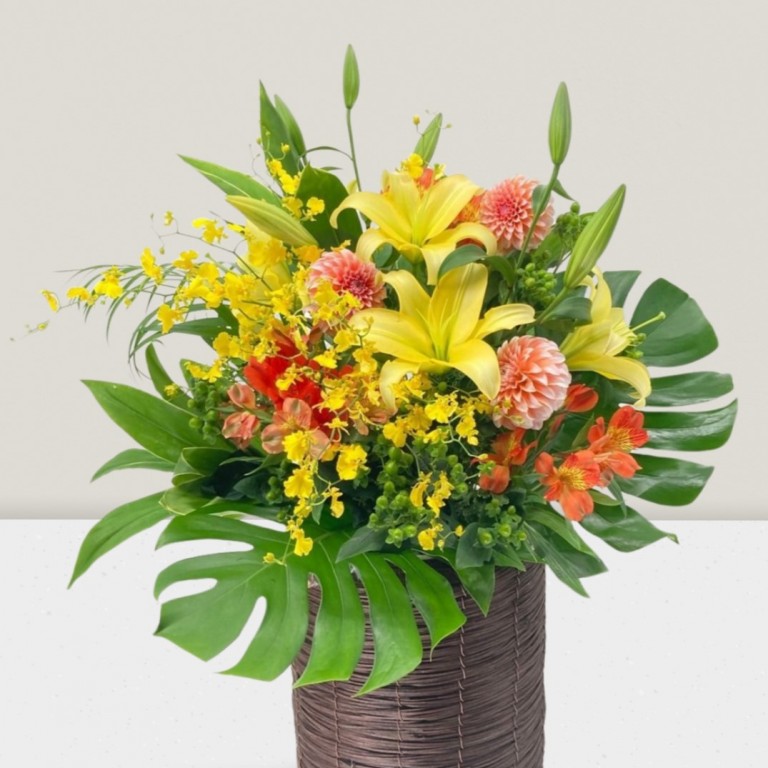 祝花でも人気のイエローとオレンジのお花でまとめた台付きアレンジメントです。
