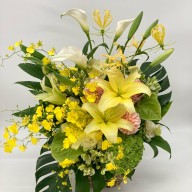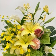 香りのよいユリ、華やかなオンシジュームやグロリオサを取り入れたゴージャスなアレンジメントは、心を弾ませ、見る人を楽しい気分にさせてくれます。