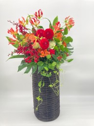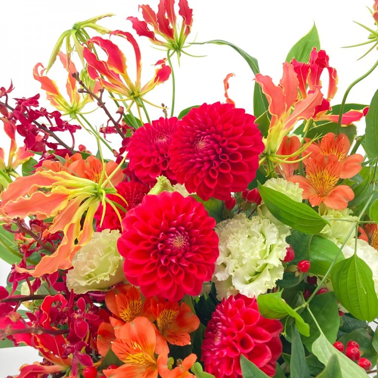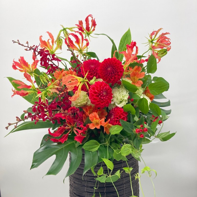 ダリアなどの情熱的なレッドカラーでまとめたアレンジメントは、高級感のあるグロリオサがポイント。