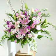 明るい春のお花をぎゅっと集めてアレンジしました。サイズは高さ180cm、幅80cmほどで存在感は抜群。花台がなくてもこのまま飾っていただけます。 一番人気の桜の枝をあしらったピンク系のアレンジメントは、新たな門出をお祝いするのにぴったりです。 4/1(火)のお届けをご指定の場合:3/14(金)16時までにご注文ください。