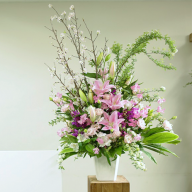 明るい春のお花をぎゅっと集めてアレンジいたしました。サイズは高さ65cm、幅50cmほどで、式典を華やかに演出してくれます。一番人気のピンク系のアレンジメントは、新たな門出にふさわしく、桜の枝をあしらい、お祝いのシーンを盛り上げます。 4/1(火)のお届けをご指定の場合:3/14(金)16時までにご注文ください。