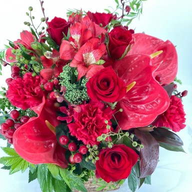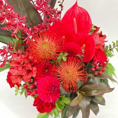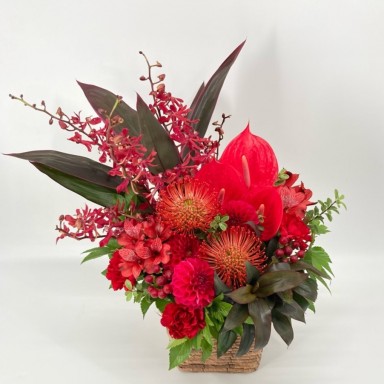 レッド系のお花を使用しておまかせでお作りします。 こちらはフローリストおまかせ商品ですので、 花材とテイストのご指定はお受けできません。 シックなレッド系のお花でお作りする、モダンなアレンジメントです。 レストランやカフェなどの開店祝い、お誕生日のギフトとしておすすめです。