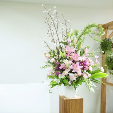 明るい春のお花をぎゅっと集めてアレンジしました。サイズは高さ160cm、幅60cmほど。 ※台が変更になる場合がございます。 一番人気の桜の枝をあしらったピンク系のアレンジメントは、新たな門出にふさわしく、お祝いのシーンを盛り上げます。 4/1(火)のお届けをご指定の場合:3/14(金)16時までにご注文ください。