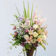 イエロー系のお花を使用しておまかせでお作りします。 こちらはフローリストおまかせ商品ですので、 花材とテイストのご指定はお受けできません。 華やかなイエロー系のお花で作った、台付きアレンジメントです。 グリーンを入れることで爽やかに仕上げました。 幅80cm、高さ160cmのサイズ感ですので、式典などの広い会場でも存在感は抜群です。 開店・開業祝い、移転祝いなどのお祝いをゴージャスに演出します。