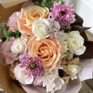 柔らかいピンク系の花でお作りする、可愛さ溢れるお祝い用ブーケです。