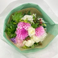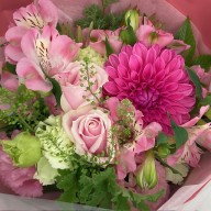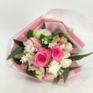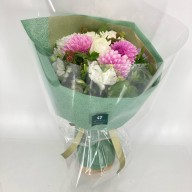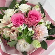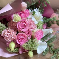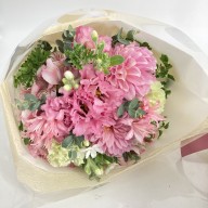 柔らかいピンク系の花でお作りする、可愛さ溢れるお祝い用ブーケです。