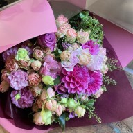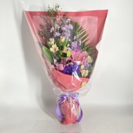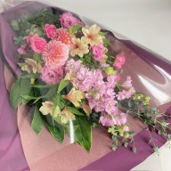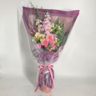 柔らかいピンク系の花でお作りする、可愛さ溢れるお祝い用ブーケです。