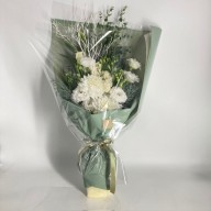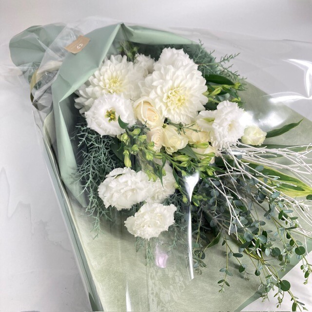 ナチュラルなホワイト系の花でお作りする、柔らかい印象のお祝い用ブーケです。