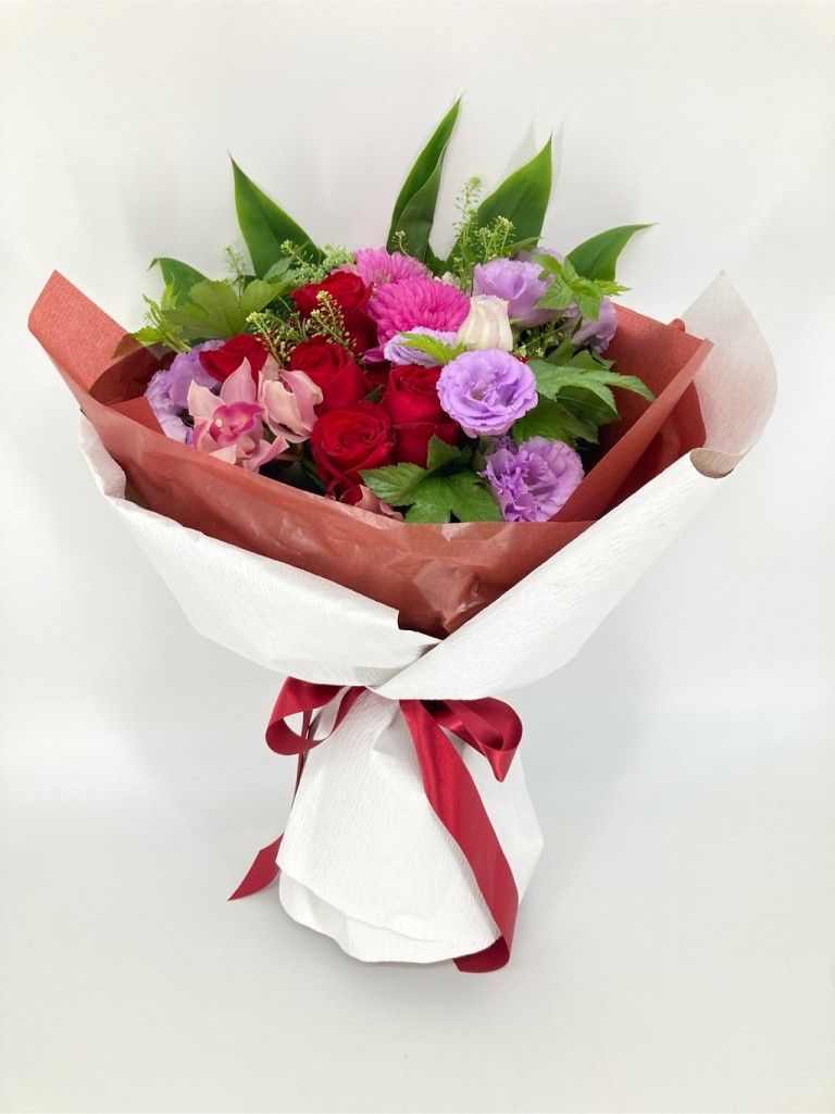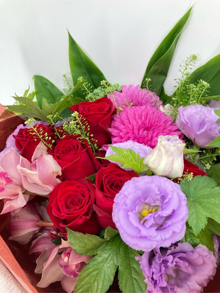 バラやランをふんだんに使って豪華にまとめた花束です。