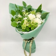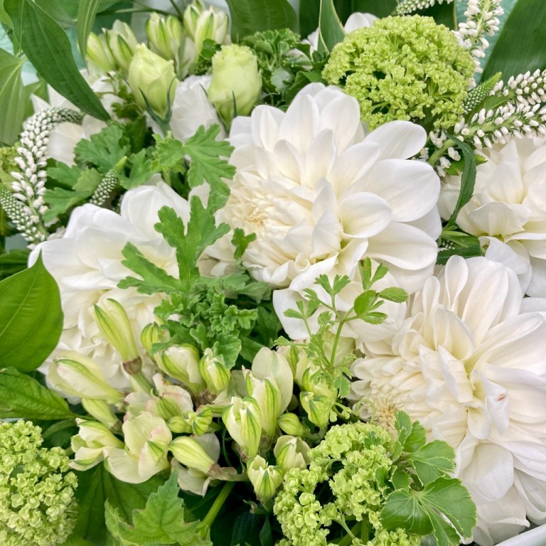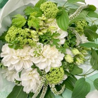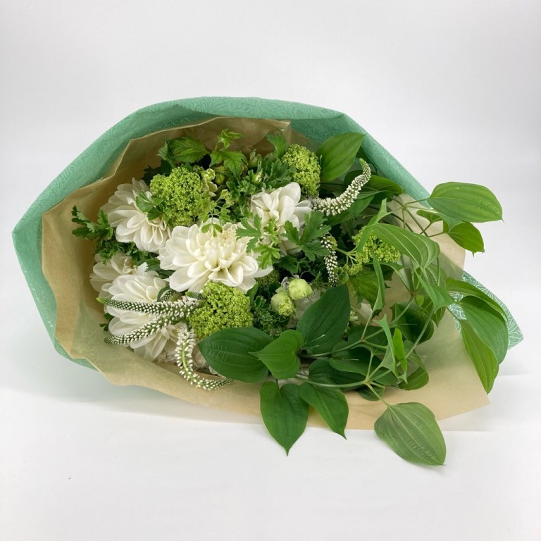 白のダリアとグリーンをたっぷりと使った花束は、性別を選ばず万人に喜ばれる組み合わせ。