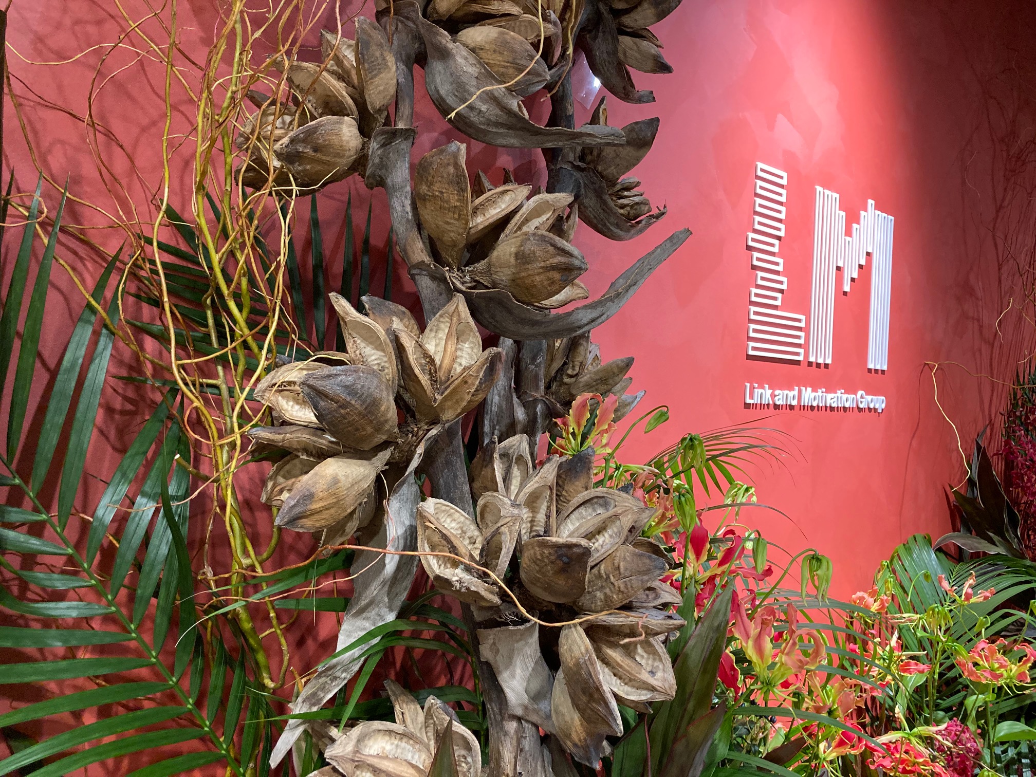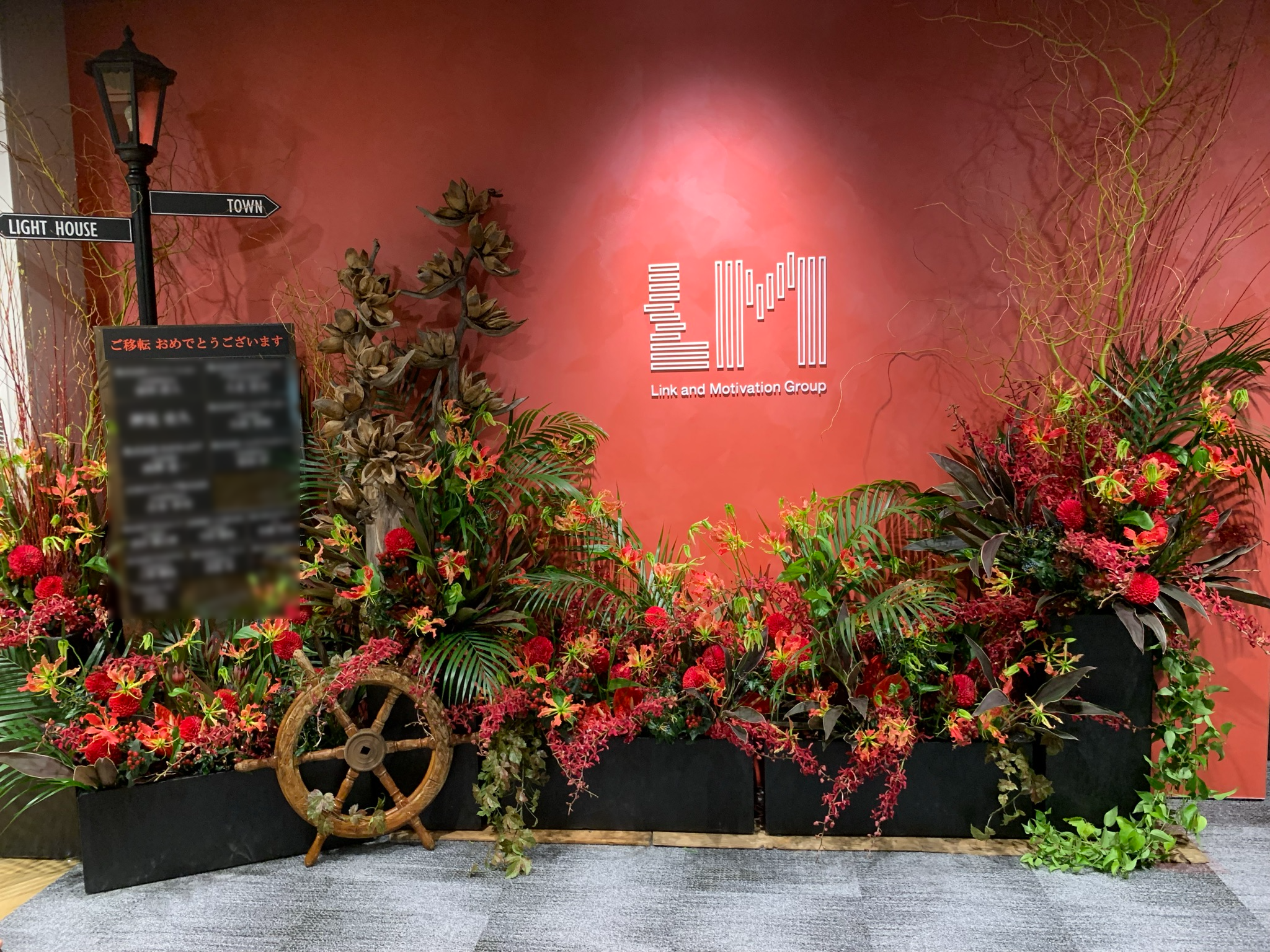 全体的にリンクアンドモチベーション様のコーポレートカラーでまとめました。赤い壁にお花が良く映えます。
