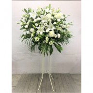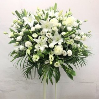 お供え用に白グリーンでまとめたスタンド花 お供えスタンド¥22,000(税込) お供え用のスタンド花です。白とグリーンで上品にまとめ、故人を弔う気持ちを表現しました。