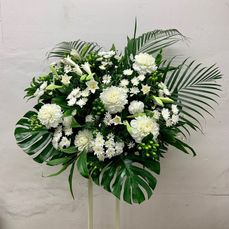 お供え用のスタンド花です。白とグリーンで上品にまとめ、故人を弔う気持ちを表現しました。