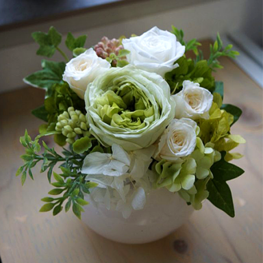 ![]()  清潔感あるナチュラルな雰囲気が素敵なアレンジメント プリザーブドフラワー高さ14cm × 直径12cm/G-022 ¥5,500(税込)