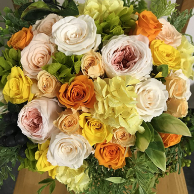 やわらかなビタミンカラーのお花を、まあるくアレンジ