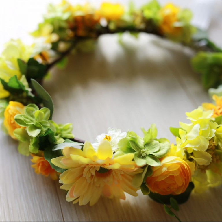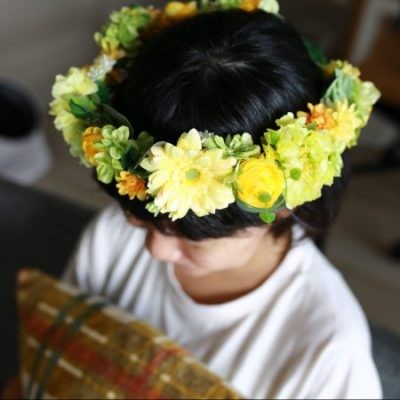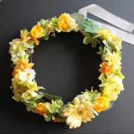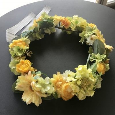 ボリュームたっぷりなアーティフィシャルフラワーの花冠です。装飾部分は50cm程度、リボンでサイズ調整できます。