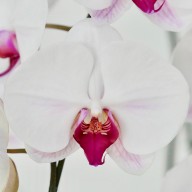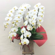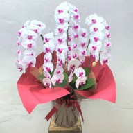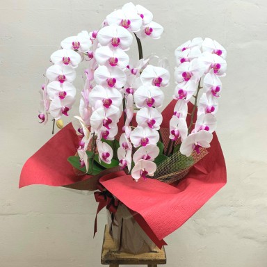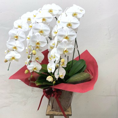 大輪のセミアルバの胡蝶蘭です。 花の中心のリップと呼ばれる部分だけが濃いピンクになっており、白色とのコントラストが美しい一品です。他の胡蝶蘭と並んだ際に、少しだけ目立たせたいという時におすすめです。 輪数は50~55輪以上。法人様のギフトとして、移転・増床祝い、開業祝い、上場祝いに人気の胡蝶蘭です。