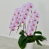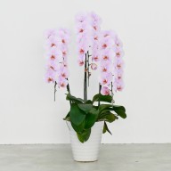 淡いピンクがかわいらしい、胡蝶蘭三本立ての商品です。法人様のギフトでは白色が多いのですが、女性宛ての昇進祝いや就任祝いとして喜んでいただけるギフトです。 輪数は36~40輪以上、大きさは幅45cm、高さ85cmほどですので個人のお誕生日のお祝いギフトとしても人気の胡蝶蘭です。 お祝いのメッセージに、胡蝶蘭の花言葉「幸せが飛んでくる」を添えて、お贈りしてはいかがでしょうか?
