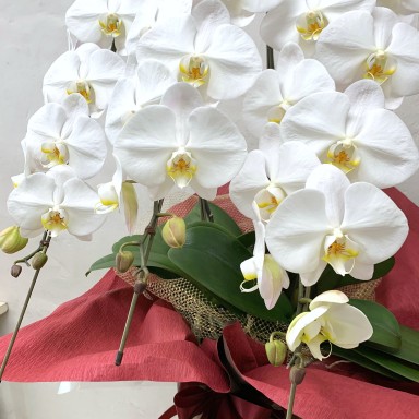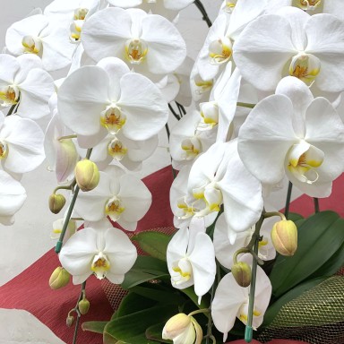 なかなかお目にかかることがない、10本立ちのとても豪華な胡蝶蘭です。溢れるように咲き誇る花々が上品で華やかさも際立ちます。 輪数は100輪~110輪以上。特別なお客様にへのギフトとして、上場・移転などのお祝いとして人気があります 大きな商品ですので、置く場所のスペースをご確認の上、お贈りされることをおすすめします。