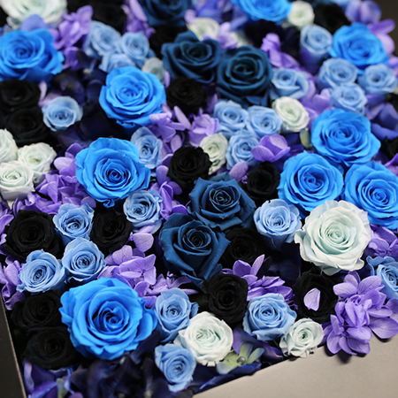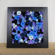 ブルー系の薔薇でまとめた豪華なフレームプリザーブドフラワーです。上品なパープルのお花を合わせてエレガントな印象に仕上げました。青いバラは近年日本で開発が成功し、花言葉も「不可能」から「夢かなう」となり、新しい前向きなイメージになりました。企業のコーポレートカラーにあわせた法人ギフトとしてもおすすめです。フレームのアレンジメントは立てかけたり、絵画のように壁に飾ることもできます。