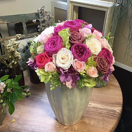 シックなピンクやワインレッドを基調とした上品なアレンジメント。大人の女性にもぴったりです。器も存在感があり、華やかさと重厚感のある雰囲気を演出します。