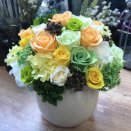 淡いオレンジやグリーン系の色味でまとめた、やわらかい雰囲気のアレンジメント。送別やお誕生日のお祝いにも最適です。他の色味でもお作りできますので、備考欄にご要望をご記入ください。