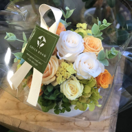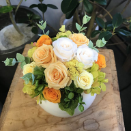 ソフトな色合いのオレンジとオフホワイトを基調としたプリザーブドフラワー。コロンとした丸いフォルムが愛らしく、特別な日でなくても、ちょっとしたプレゼントにも喜ばれます。