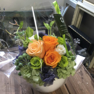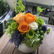 男女問わずお贈りいただけるオレンジとグリーンの明るいプリザーブドフラワー。小ぶりですが、置くだけでお部屋がパッと明るくなる存在感があります。ビタミンカラーのオレンジは気持ちを前向きに、元気にする効果も期待できます。