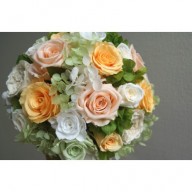 アイアン付きバスケットに可愛らしくアレンジしたプリザーブドフラワーです。淡いイエローやオレンジにグリーンを合わせ、ナチュラルで爽やかな印象です。受付や棚の上に置くのにちょうどいいサイズです。ナチュラルな内装の美容室のオープン祝いなどにおすすめです。