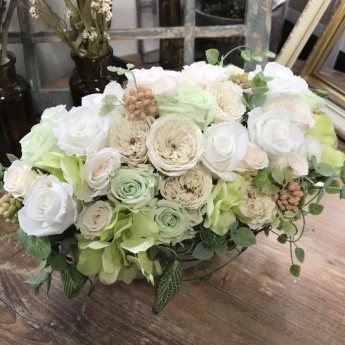 ホワイトグリーン系でまとめたプリザーブドフラワーのアレンジメントです。アンティークホワイトのバラと柔らかいグリーンを合わせ、落ち着いた雰囲気です。ナチュラルな雰囲気もありますので、とくに木目調の家具との相性がとても良いです。開店祝いなどのお祝いにおすすめです。 店舗のイメージにあわせてお選びください。
