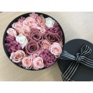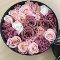 上品なピンクとパープルの色合いが広がるプリザーブドフラワーのボックスアレンジメントです。甘すぎないピンクと黒のボックスのコーディネートが大人可愛い印象です。結婚記念日や誕生日祝いなど、女性向けの贈り物にぴったりです。ボックスアレンジメントは蓋を開けたときのサプライズを演出できます。持ち運びもしやすいのでおすすめです。