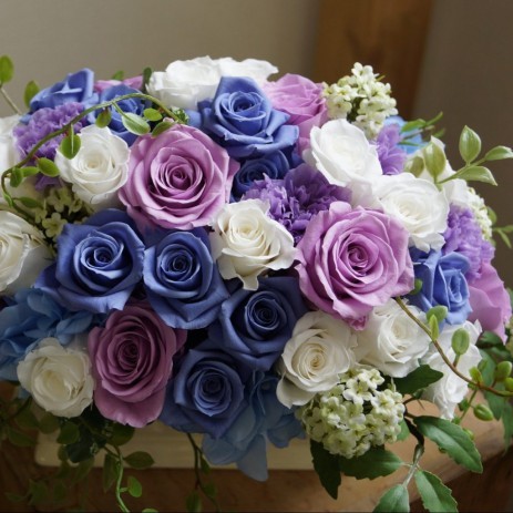 上品なブルーとパープルの組み合わせがエレガントな印象を与えるプリザーブドフラワーです。派手すぎない色合いで、落ち着いた空間を演出してくれます。ブルーとパープルはどちらも気持ちを落ち着かせてくれる癒やし効果のある色といわれています。生花と見間違えるようなプリザーブドフラワーをお楽しみください。