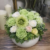 グリーン・ホワイト系のお色味のプリザーブドフラワーアレンジです。