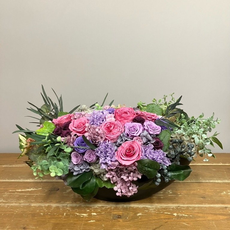バイオレット・ピンク系のお色味のプリザーブドフラワーアレンジです。