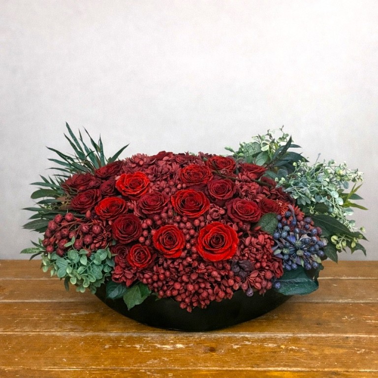 横へと優雅に広がるフォルムが特徴のプリザーブドフラワーは