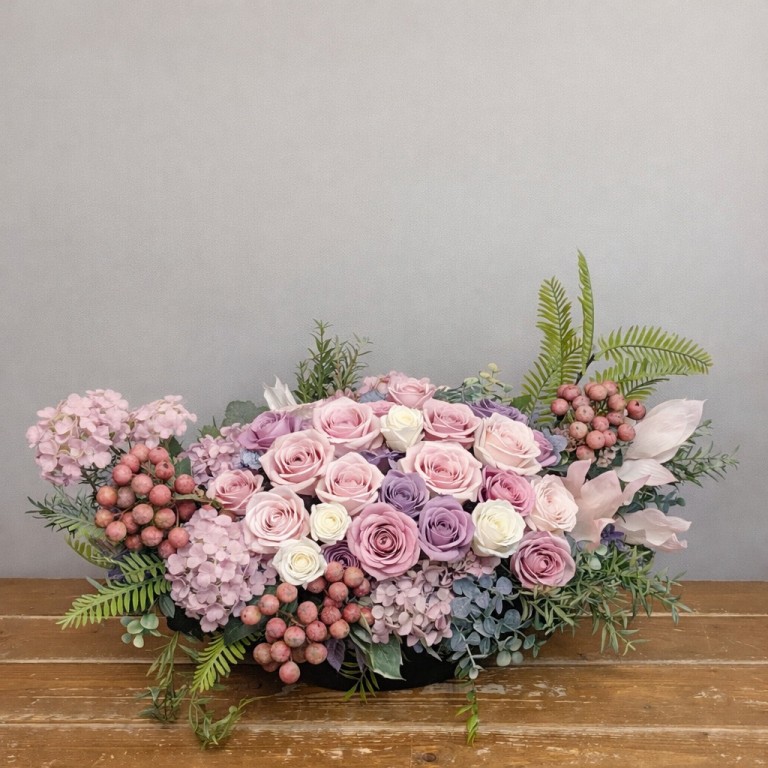 横へと優雅に広がるフォルムが特徴のプリザーブドフラワーは