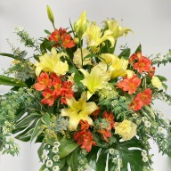 鮮やかなオレンジと黄色がよく映える華やかなアレンジメントです。