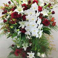 お花のクイーン的存在である胡蝶蘭と白い百合で文句なしの組み合わせです。豪華に2つのお花を使い、どんなシーンや場面、会場に出しても間違いなく目立ち、映えることでしょう。昔から紅白は縁起がいい色と日本では言われていることから、結婚、各種お祝いごと、表彰式典、祈念パーティなど豪華な場面にピッタリの商品です。