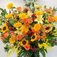 こちらはフローリストおまかせ商品ですので、花材とテイストのご指定はお受けできません。鮮やかなオレンジと黄色がよく映える華やかなアレンジメントです。