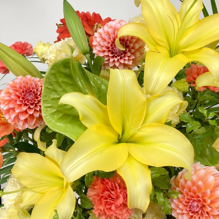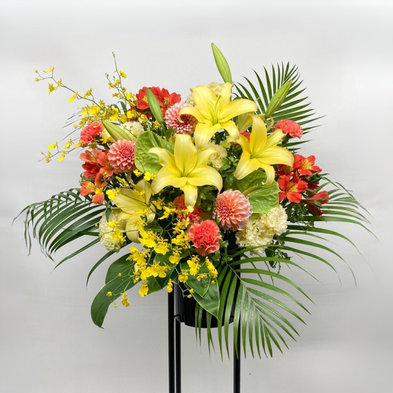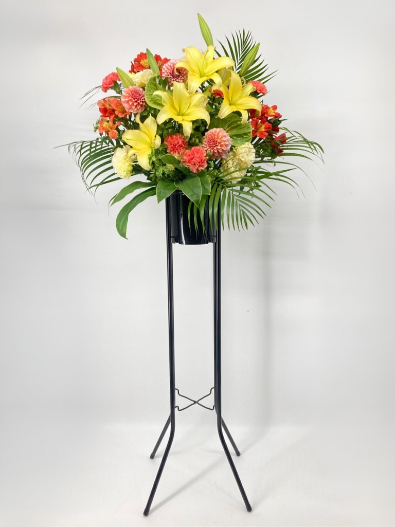 華やかなイエローオレンジ系のお花で作った、スタンド型アレンジメントです。