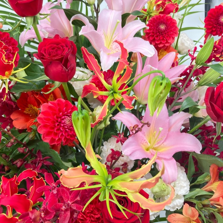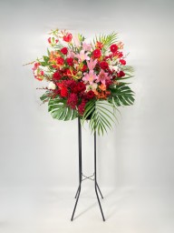 華やかで情熱的な赤ピンク系のお花で作った、スタンド型アレンジメントです。