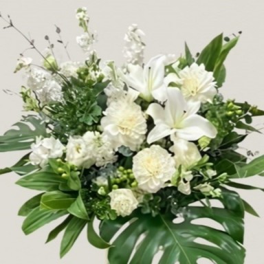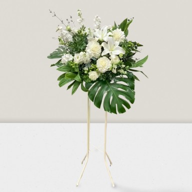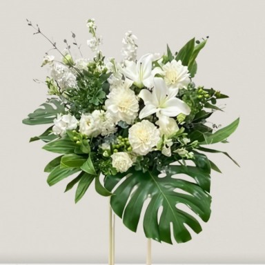 ホワイト系のお花を使用しておまかせでお作りします。 こちらはフローリストおまかせ商品ですので、 花材とテイストのご指定はお受けできません。 ナチュラルなホワイト系のお花でお作りする、ボリューム感たっぷりのスタンド花です。 淡い黄色や爽やかなグリーンと合わせて清潔感のある印象に仕上げます。 企業様の式典など大きな会場でも映えるアレンジメントです。 開店・開業、移転、就任、上場などのお祝いをゴージャスに演出します。