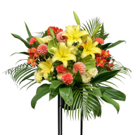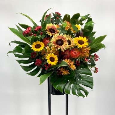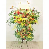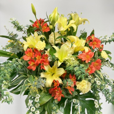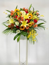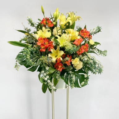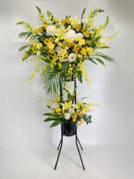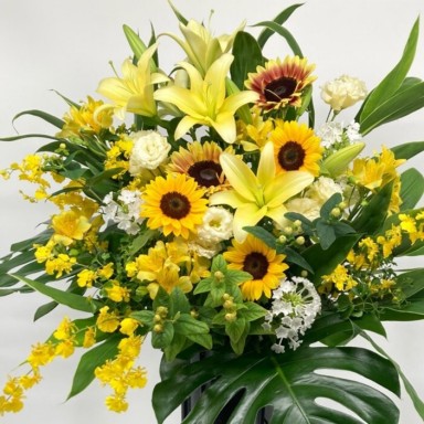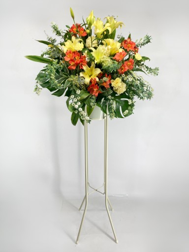 イエロー系のお花を使用しておまかせでお作りします。 こちらはフローリストおまかせ商品ですので、 花材とテイストのご指定はお受けできません。 華やかなイエロー系のお花で作った、台付きアレンジメントです。 グリーンを入れることで爽やかに仕上げました。 新たな門出となる開店を華やかにお祝いする、 スタンド型のアレンジメントで式典などの広い会場でも存在感は抜群です。 移転祝いなどのお祝いをゴージャスに演出します。