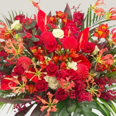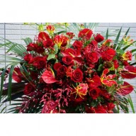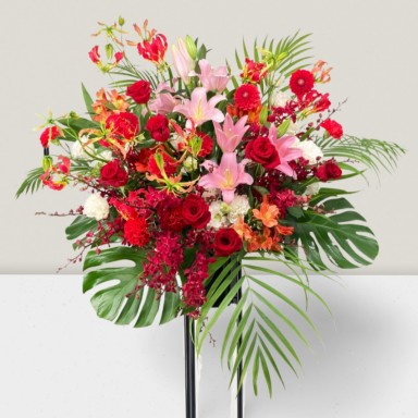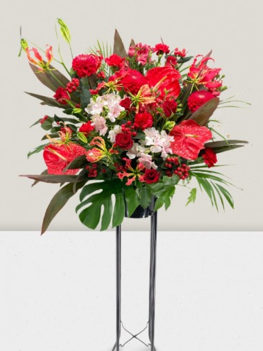 レッド系のお花を使用しておまかせでお作りします。 こちらはフローリストおまかせ商品ですので、 花材とテイストのご指定はお受けできません。 新たな門出となる開店を華やかにお祝いする、スタンド型のアレンジメント。 おめでたいシーンにぴったりの赤は強い情熱を感じさせるお色です。 空間をぱっと華やかにしてくれますよ。 大切なビジネスシーンで、豪華にお祝いを盛り立てます。